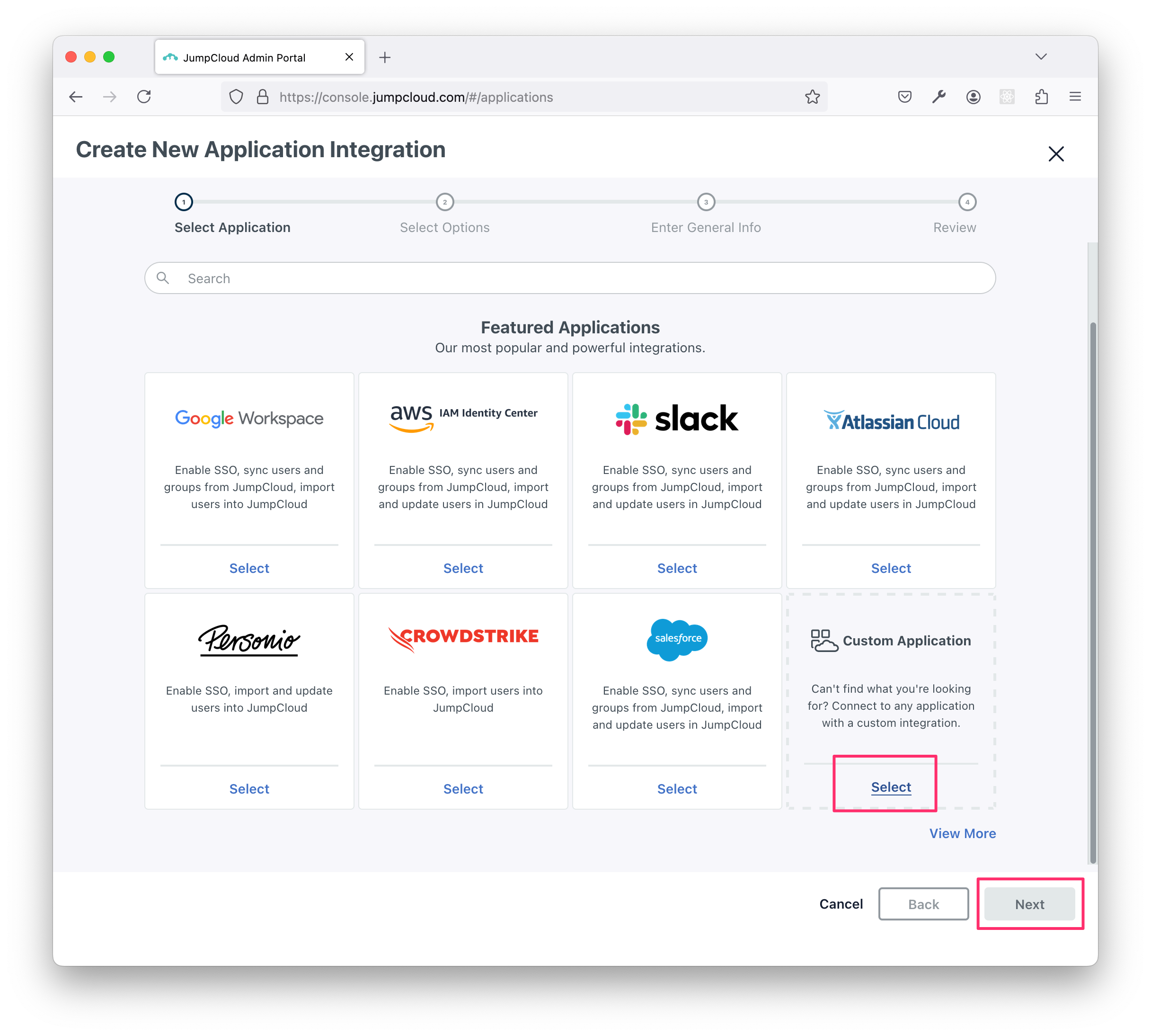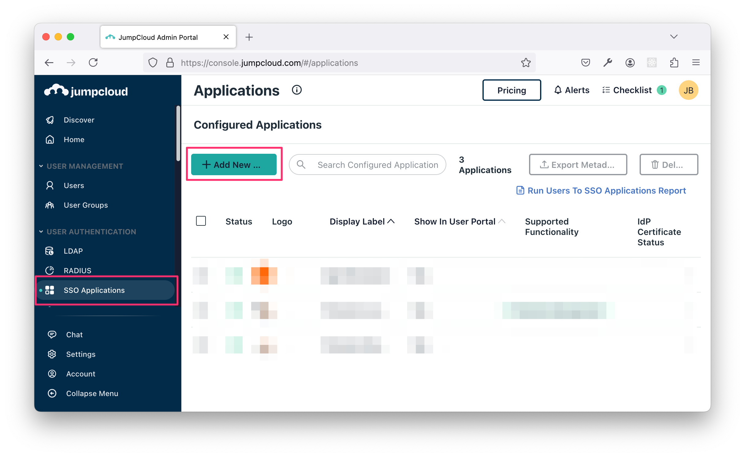 Login to your JumpCloud admin portal, click SSO Applications and then + Add New Application.
