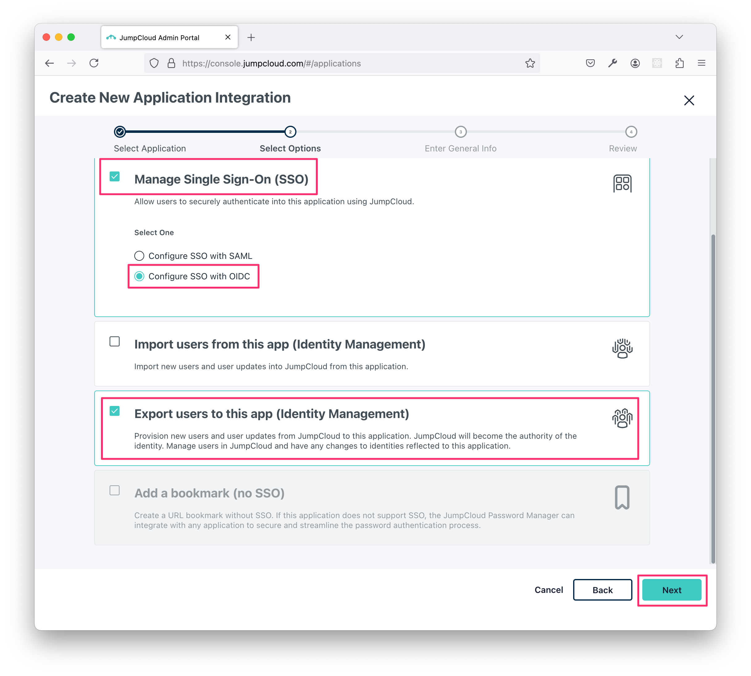 Optionally, select Export users to this app (Identity Management) if you plan to set up directory sync for this connector.