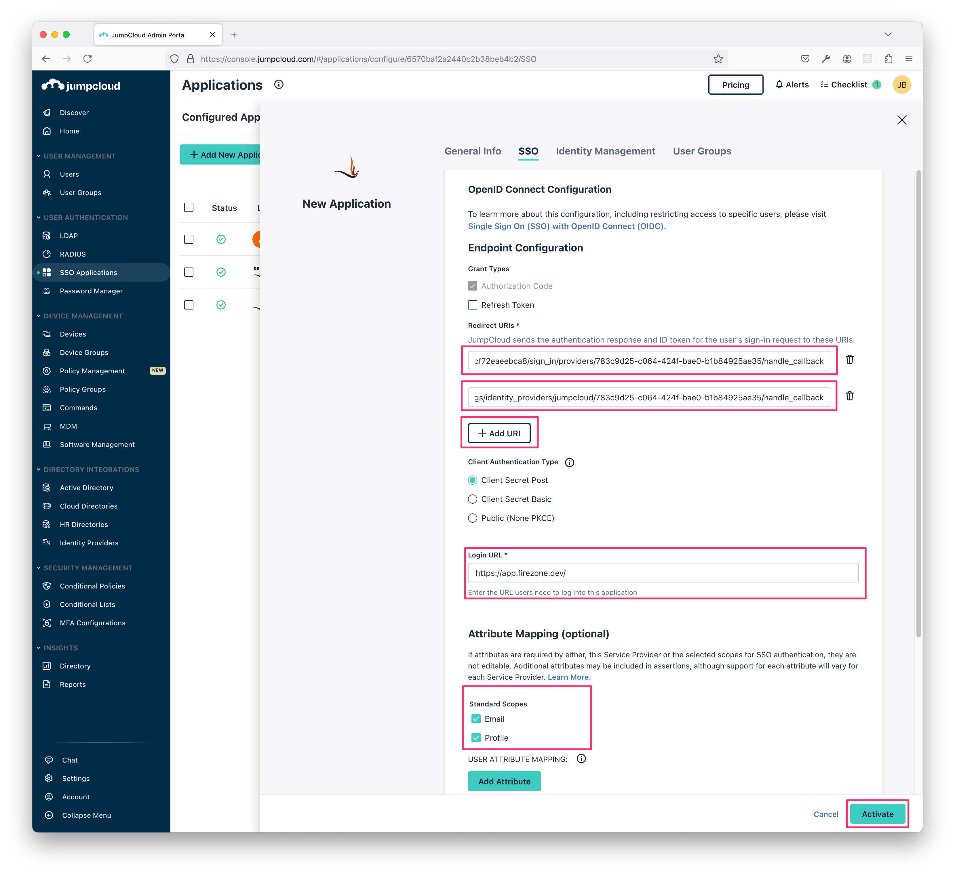 Firezone integrates with JumpCloud using a custom connector that supports both authentication and directory sync. Use this guide if you're looking to setup SSO with JumpCloud for your Firezone account and optionally sync users and groups from JumpCloud to Firezone.